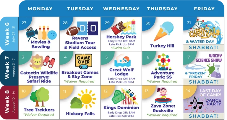 Travel Camp is a five-day a week program, running Monday through Friday and is unlike anything else at Beth Tfiloh Camps. It’s the perfect blend of thrills, memories, and bonding with friends. Travel Campers and their summer camp counselors take field trips 4 out of 5 days per week (they enjoy being at our big camp site every Friday). Visiting fun-filled places such as amusement parks, water parks, laser tag venues, indoor trampoline parks and much more. Travel Campers will soar through the air, speed down slides, and have so much fun on many amazing adventures. Occasionally, there is a trip that requires an early-morning camp arrival time, or a late pickup from camp.